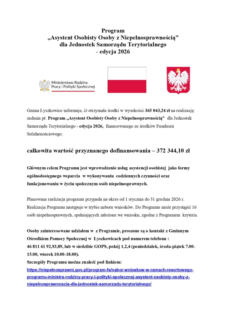 Gmina Łyszkowice informuje, iż otrzymała środki w wysokości 365 043,24 zł na realizację zadania pt: Program „Asystent Osobisty Osoby z Niepełnosprawnością” dla Jednostek Samorządu Terytorialnego – edycja 2026, finansowanego ze środków Funduszu Solidarnościowego.