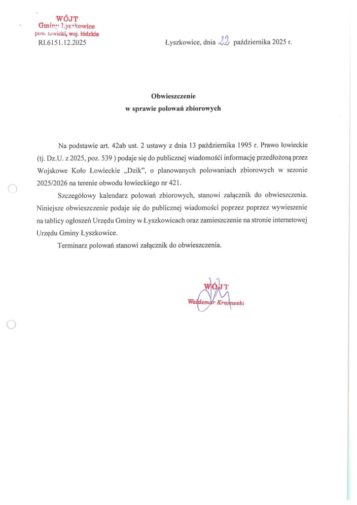 OBWIESZCZENIE W SPRAWIE POLOWAŃ ZBIOROWYCH